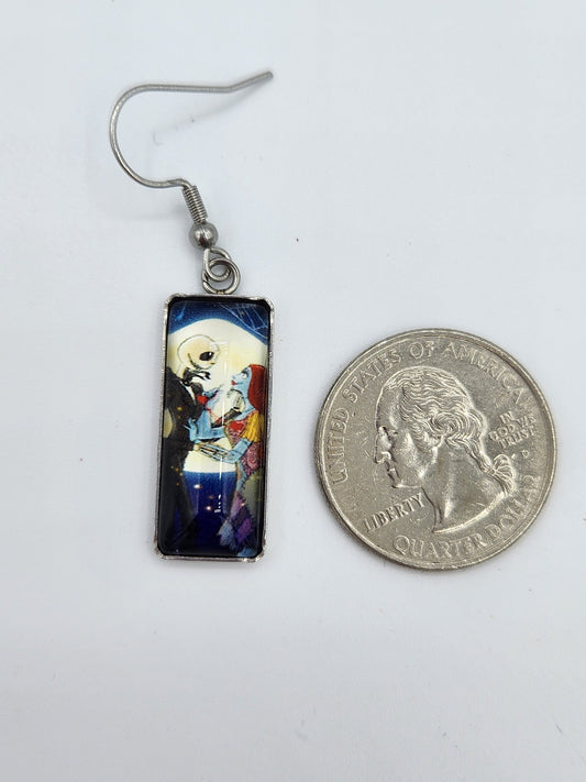 Sally-inspired spooky earrings with stitched face and red hair design.