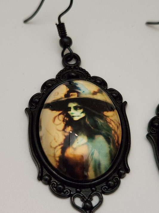 Gothic Witch Cameo Earrings – Halloween Witch Jewelry, Spooky Goth Earrings, Witchy Gift, Vintage Style Cameo Dangle Earrings, Occult Jewelry